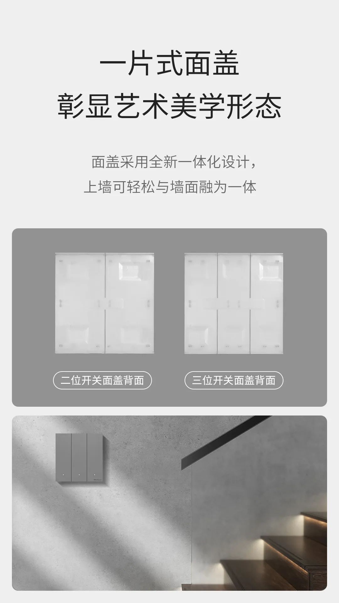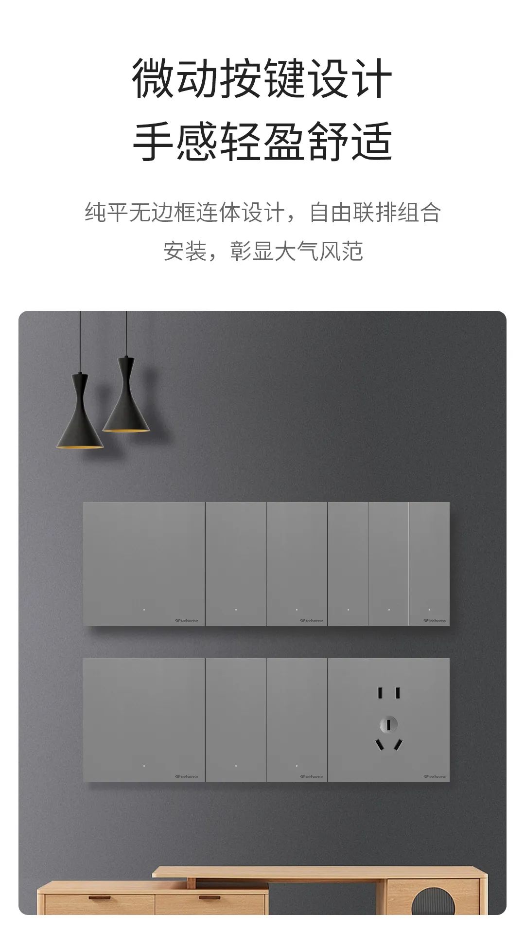 以創(chuàng)新的無邊框一片式面蓋設(shè)計(jì),打破傳統(tǒng)的有邊開關(guān)創(chuàng)作形式,開關(guān)如鏡面般純平,避免面板拼縫處不平,影響墻面美觀。