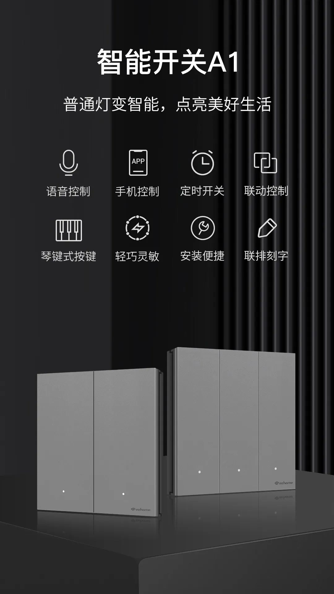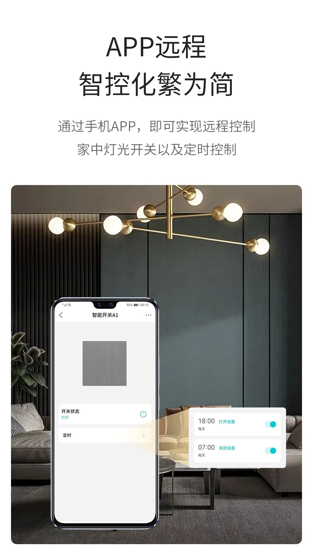 智能開關(guān)A1具備手機(jī)APP控制、語音控制、場景編輯、智能聯(lián)動(dòng)、定時(shí)開關(guān)等多種控制功能。