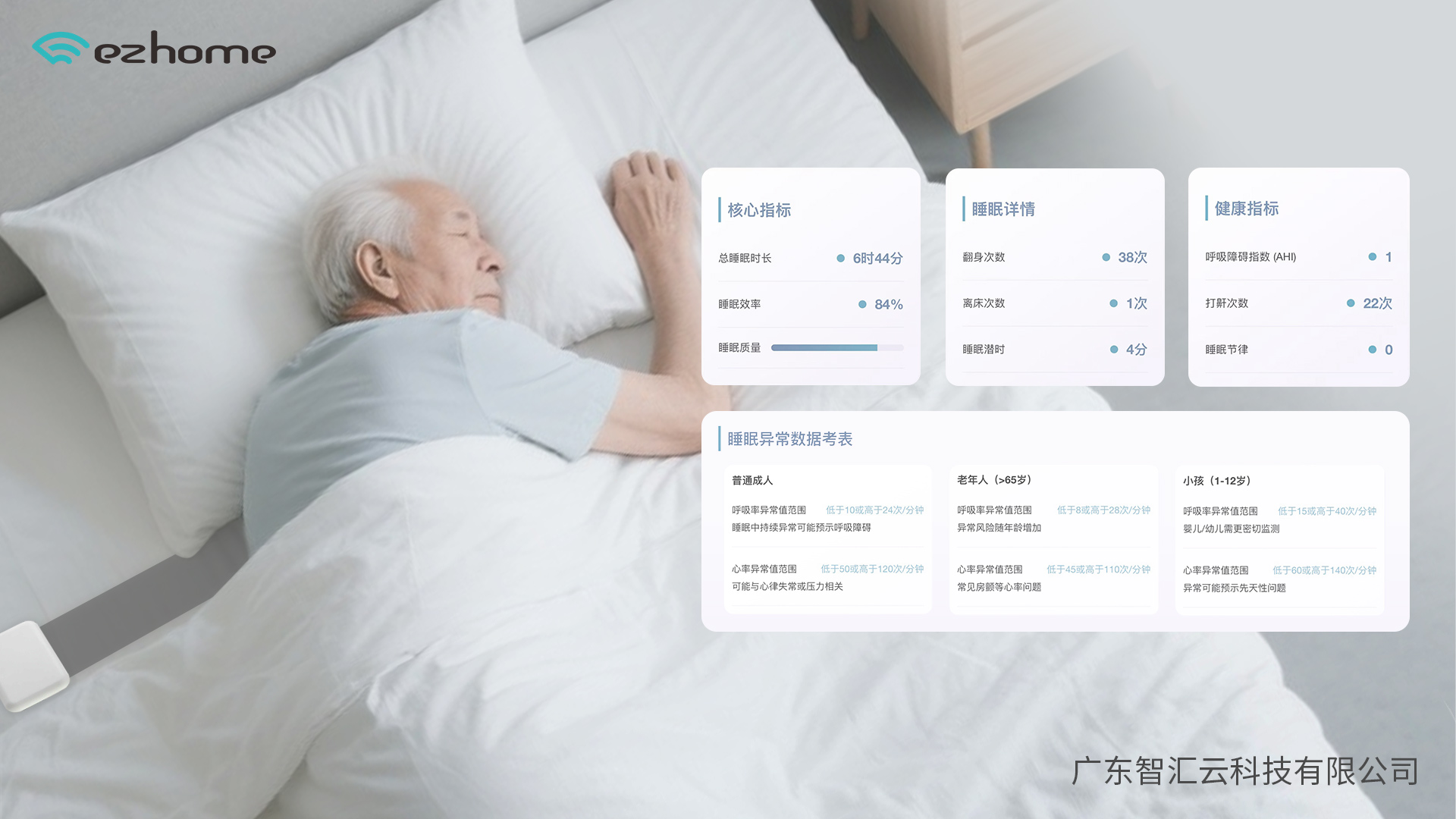 通過健康檢測設(shè)備實(shí)現(xiàn)無感采集,長期跟蹤用戶睡眠呼吸頻率和體動數(shù)據(jù),可生成睡眠健康報(bào)告;如發(fā)現(xiàn)心率呼吸暫停或異常,及時推送求助信息提醒;幫助運(yùn)營機(jī)構(gòu)挖掘用戶需求,提供如慢病干預(yù)、康復(fù)理療等增值服務(wù)。