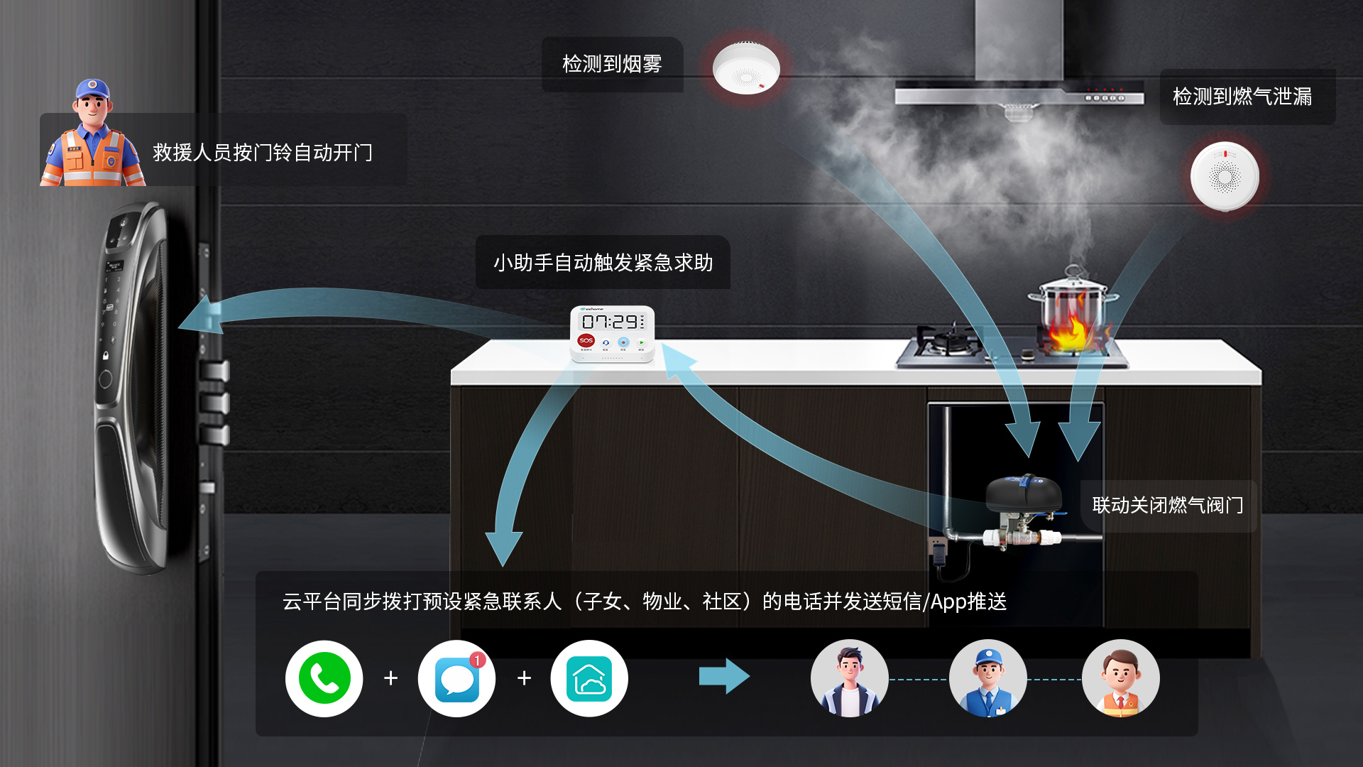 多數(shù)產(chǎn)品僅支持單點觸發(fā),而我們的設(shè)備間可實現(xiàn)“矩陣式協(xié)同”。 比如:險情自動化處理: 當煙霧/燃氣傳感器檢測到險情 → 首先關(guān)閉燃氣閥門→系統(tǒng)即刻自動觸發(fā)SOS報警→ 云平臺同步撥打預(yù)設(shè)的子女、物業(yè)、社區(qū)電話并發(fā)送APP推送 → 救援人員趕到后,可通過觸發(fā)智能門鎖的特定權(quán)限(如門鈴按鍵開門)無阻礙進入,為生命救援搶得黃金時間。