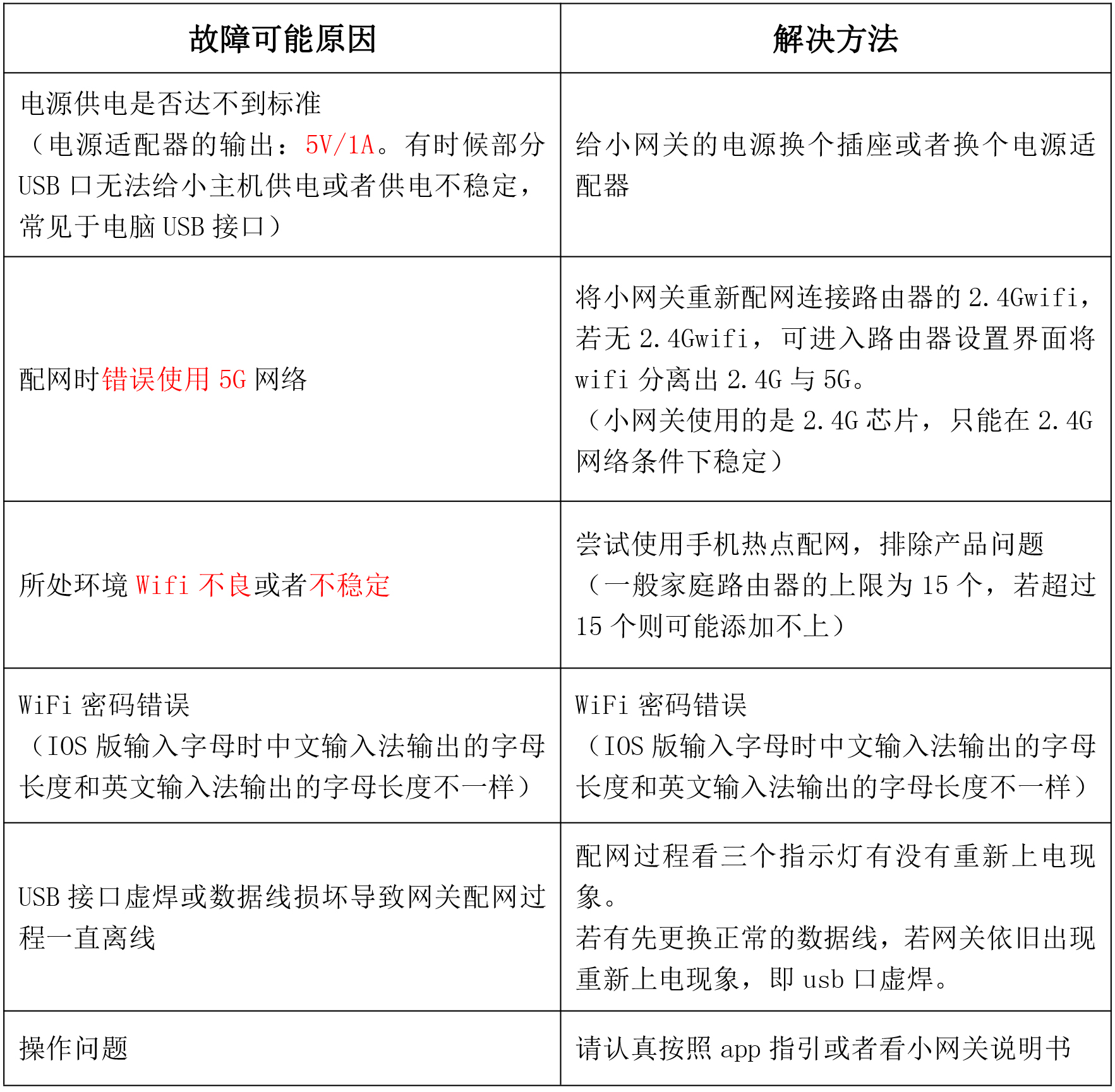 10.窗簾的開關狀態(tài)和APP上的開關狀態(tài)是相反的要怎么解決① 需要在電機上長按配網(wǎng)按鍵5秒以上,便可調換正反轉,即開變?yōu)殛P,關變?yōu)殚_。① 屬于行程問題,窗簾電機有行程記憶功能,使用之后就正常了。① 將小網(wǎng)關挪近窗簾電機,看窗簾電機是否上線,若上線即窗簾超出網(wǎng)關控制距離;② 用遙控控制窗簾電機看窗簾電機控制距離是否正常,若窗簾電機控制距離太短,考慮窗簾電機2.4g模塊異常。① 調光面板在開關或者調節(jié)亮度的時候,不能一直按,它有一個漸變的過程,沒有即開即關;② 調光面板關閉的時候,會記錄最后的亮度,下次開啟的時候,開啟的是上一次關閉時的亮度;③ 調光面板添加時,需要離網(wǎng)關近一些。① 多個RGB接在同一條燈帶上時,控制了其中一個RGB模塊時,會帶動其他RGB模塊顏色變化;② RGB使用時,如果顏色錯誤,可能是因為接線的時候接錯,應該嚴格按照模塊絲印與燈帶燈線對應。