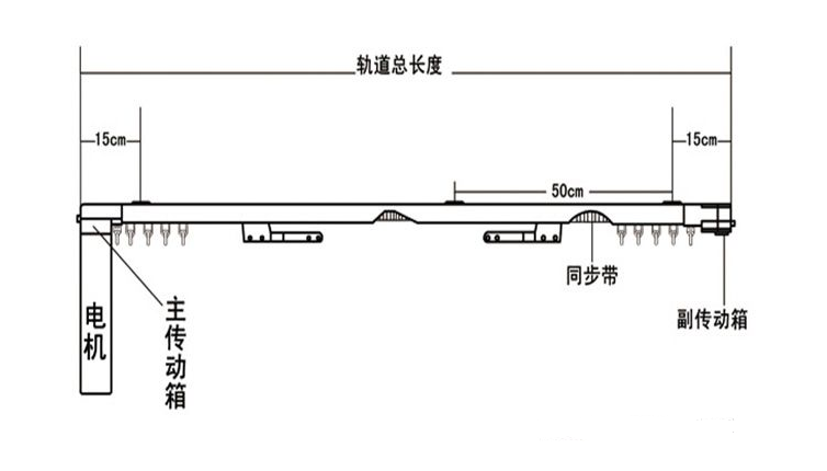 3、軌道總長度為主傳動箱(電機) 、軌道長度、副 傳動箱之和。